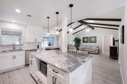 Wow! Great pride was taken with this charming home and its quality improvements and attention to detail. This remodeled home has an open concept kitchen and wooded beam ceiling in the living room that makes the home feel spacious. Fall in love in, with the solid-wood cabinets and a large granite island with seating that opens to living and dining room for a great space for entertainment. Stainless steel appliances and washer/dryer are included. Three comfortably sized bedrooms surrounding two nicely renovated bathrooms, including a creatively tiled shower. Enjoy the luxury of porcelain tile flooring and new interior panel doors. There's even a locked linen closet within the master closet which is a great place to secure valuables or Christmas presents for the kids. Imagine yourself sitting under the 37' x 10' covered patio enjoying the shaded yard while watching the kids play in the level fenced back yard. A walkway leads to a large 12' x 24' workshop/shed with electricity, ideal for great storage space and more. Conveniently centrally located in Leon Valley near Remus Park, two community pools, Medical Center, USAA, 12 miles to Lackland AFB and easy access to many essential amenities. Bring your best offer soon as this home will not last!